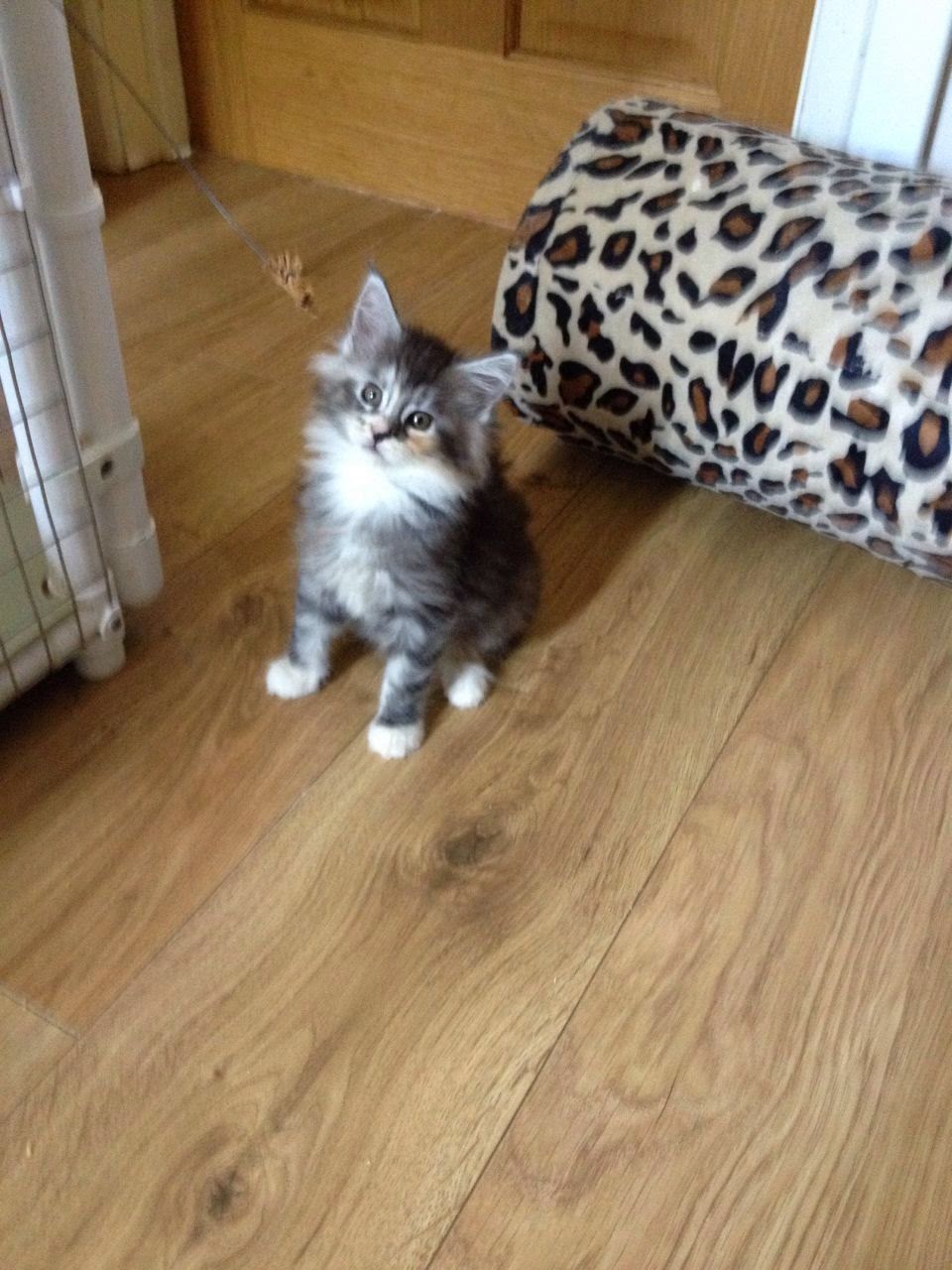 Have fluffy fur and beautiful eyes! Half Maine Coon.