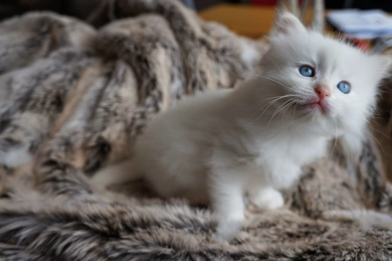 I have one white female with a slight grey smear on the top of her head and bright blue eyes with folded ears